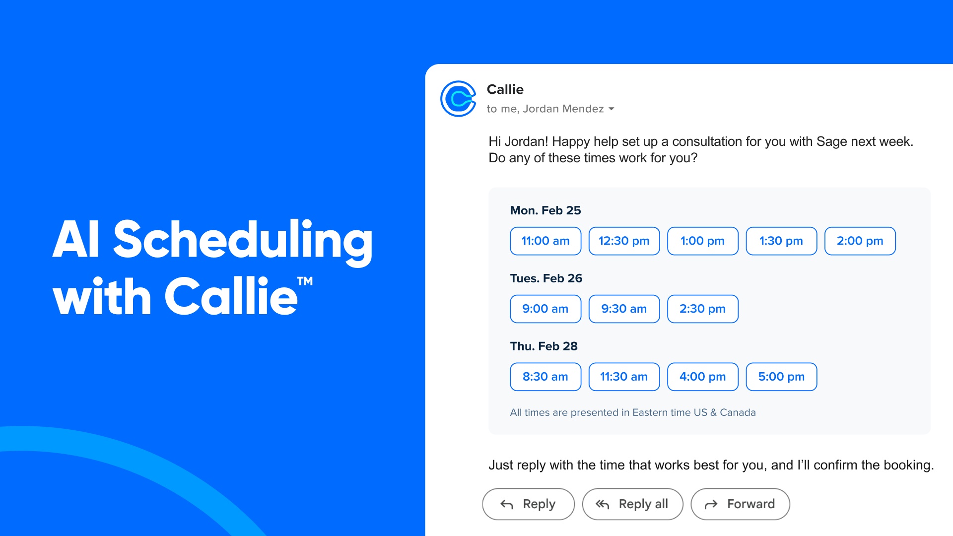 Callie™ is Calendly’s AI scheduling assistant. Callie helps you schedule meetings right from your email inbox. Just CC Callie on an email, and Callie coordinates scheduling and replies with available times on your behalf.